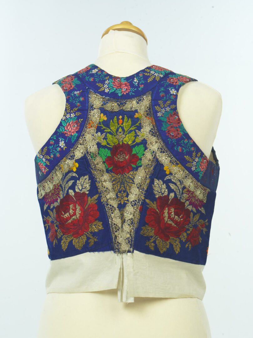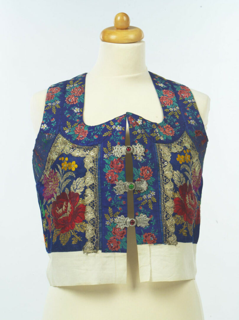Živôtik z hodvábneho brokátu je podšitý továrenským plátnom. Olemovaný je kvetovanými umelohodvábnymi stuhami. Nášivku tvorí palličkovaná čipka z kovových nití striebornej farby. Zapína sa na tri cínové sponky so sklenenými očkami.