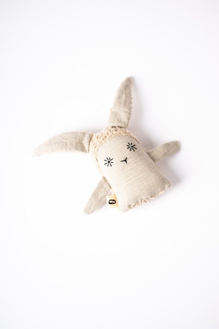 Textilné zvieratko zajko je vyrobené zo 100% ľanovej látky. Vnútri sa nachádza rolnička, ktorá vydáva jemný cinkotavý zvuk. Vyplnené je dutým vláknom.